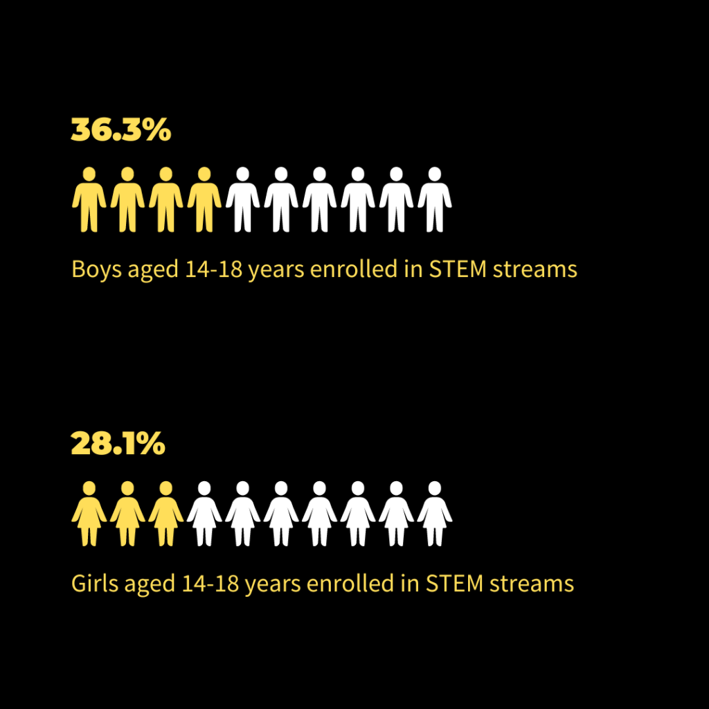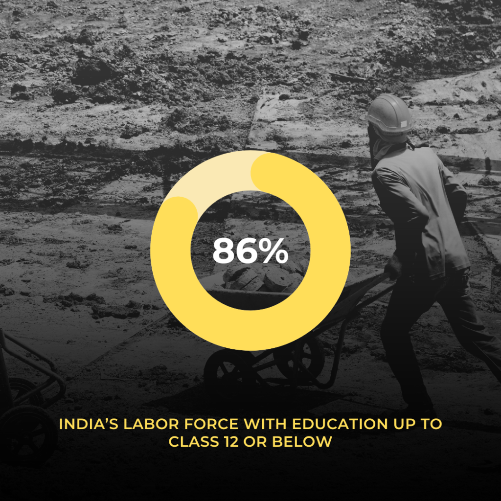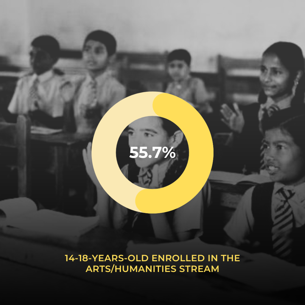 School education forms the foundation of India’s workforce. 86% of India’s labor force has education up to Class 12 or below. Around 36.3% of boys in the 14-18-year-old age group enroll in STEM streams, with a lower enrollment rate of 28.1% among girls. Most of the young people in this age group enroll in the Arts/Humanities stream, comprising 55.7%. While the exact demand for STEM professionals varies by industry, these statistics suggest a potential shortage. India has a vast young population, but it needs to equip them with the necessary skills to thrive in a technology-driven world.